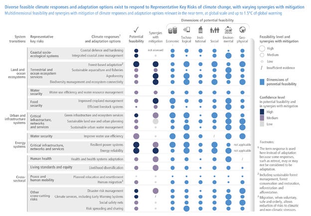 When you jump to the end of this email you'll see a 'potential feasibility' table created for politicians. Solutions in the near- and long-term (to 2100) require new ideas and leaders to enable "governance, finance, knowledge and capacity building, [and] technology" solutions (along with "catalyzing conditions" ... which I need to read more about.)